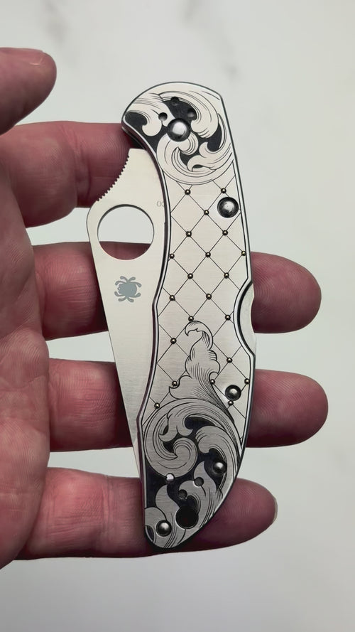 Built on a Spyderco platform, this piece flows with classic American style scrollwork — bold, sweeping, and deeply rooted in the tradition of the craft. Woven throughout are 37 hand inlaid 24 karat gold beads, each set individually into the steel, catching light with a warmth that no surface treatment can fake.